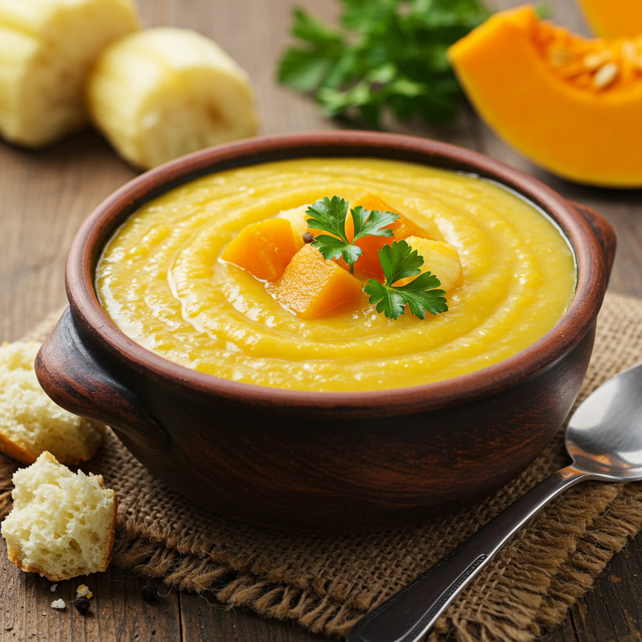 Mandioca, Abóbora, Cebola, Alho, Sal, Óleo de soja e Salsinha